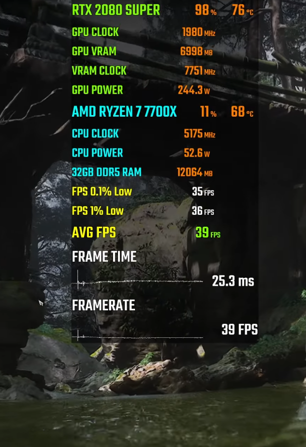 平均帧速为39 FPS,最低瞬时帧速为36 FPS,帧时间为25.3ms,CPU使用率为11%,功耗为53W,温度为68度,内存使用量为12.1GB,GPU使用率为98%,显存使用量为7.0GB,功耗为244W,温度为76度。