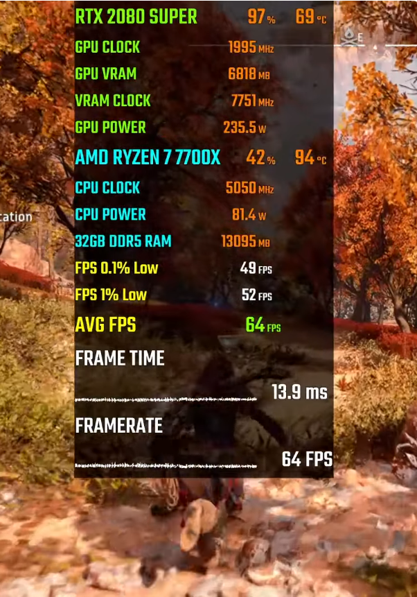 平均帧速为64 FPS,最低瞬时帧速为52 FPS,帧时间为13.9ms,CPU使用率为42%,功耗为81W,温度为94度,内存使用量为13.1GB,GPU使用率为97%,显存使用量为6.8GB,功耗为236W,温度为69度。