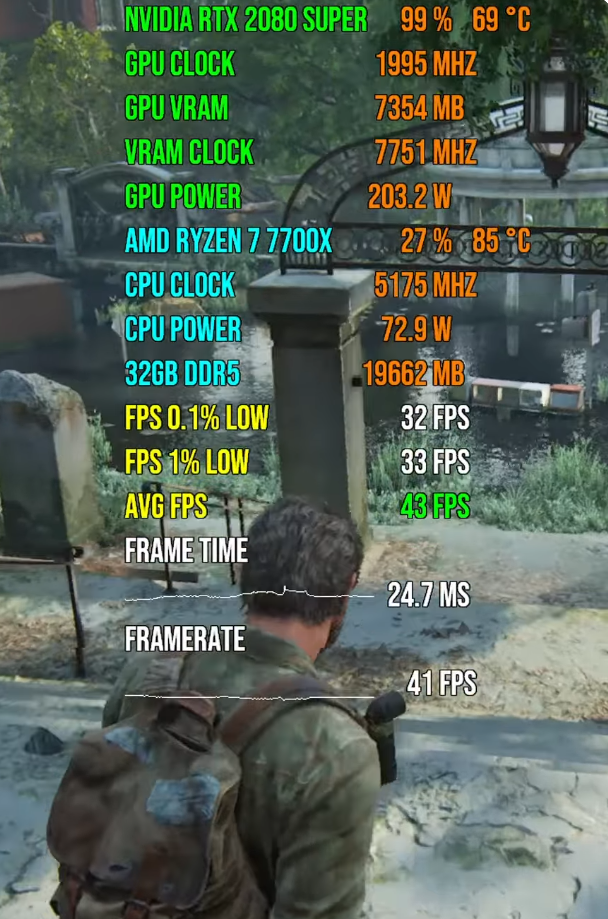平均帧速为43 FPS,最低瞬时帧速为33 FPS,帧时间为24.7ms,CPU使用率为27%,功耗为73W,温度为85度,内存使用量为20.0GB,GPU使用率为99%,显存使用量为7.4GB,功耗为203W,温度为69度。
