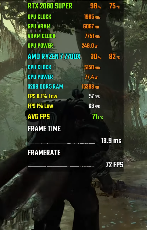 平均帧速为71 FPS,最低瞬时帧速为63 FPS,帧时间为13.9ms,CPU使用率为30%,功耗为77W,温度为82度,内存使用量为15.4GB,GPU使用率为98%,显存使用量为6.1GB,功耗为246W,温度为75度。