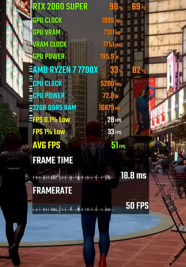 平均帧速为51 FPS,最低瞬时帧速为33 FPS,帧时间为18.8ms,CPU使用率为33%,功耗为73W,温度为82度,内存使用量为16.9GB,GPU使用率为98%,显存使用量为7.3GB,功耗为196W,温度为69度。